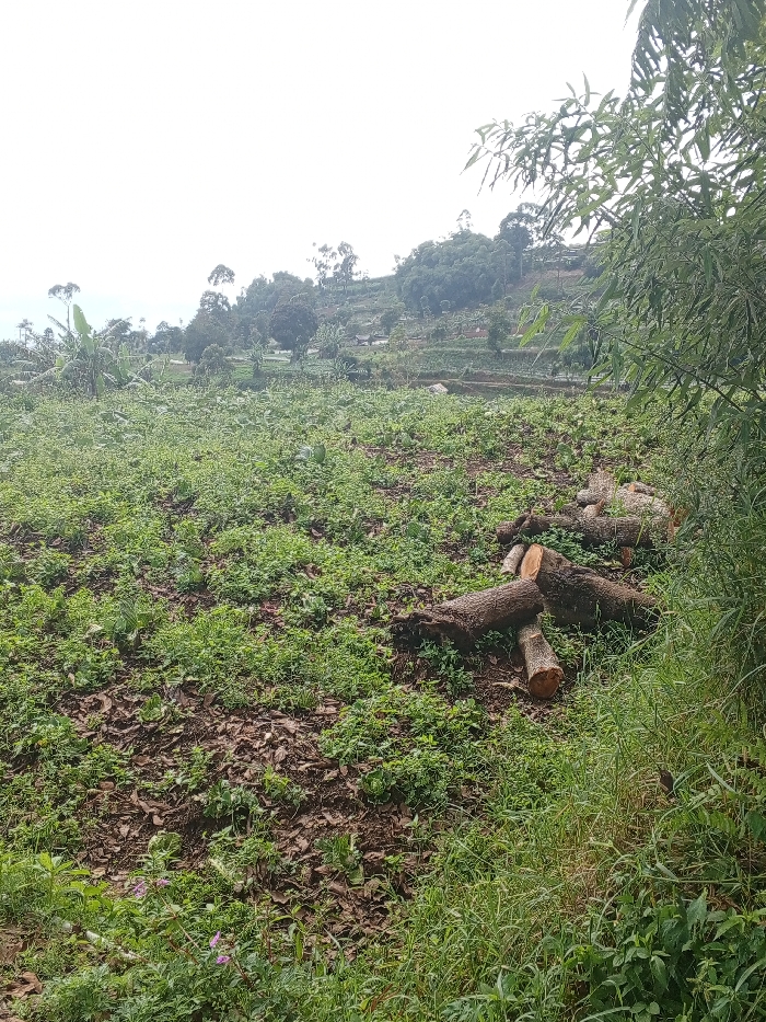 A hillside landscape features a cultivated field covered in lush green crops and scattered dry leaves. In the foreground, cut logs are piled amidst tall grasses and vegetation. The middle ground shows terraced farming on a sloping hill, with trees and structures dotting the landscape. The sky is overcast, creating a soft, diffused light across the scene. A portion of tree foliage partially obscures the right side of the view.