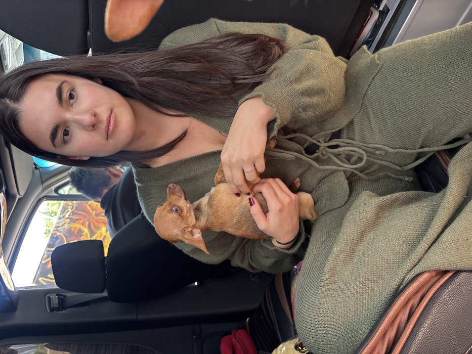 A woman with long dark hair holds a tan Chihuahua. She wears an olive green sweater set with a v-neck and drawstring closure. The puppy lies on its back, held in her hands. The woman looks directly at the camera with a neutral expression. They are in a vehicle, possibly a van, with black seating. A person is visible in the background. A colorful image is visible through the van window.