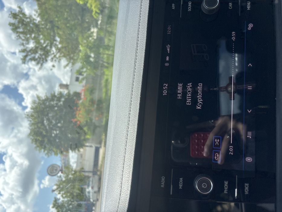The image displays a forensic view from inside a vehicle, specifically across the dashboard and through the windshield, situated in Komchén, Mexico. The foreground features a black, textured dashboard. Centered within the dashboard is a digital infotainment screen displaying the time "10:52", an external temperature of "32.0°C", and icons for Bluetooth and signal strength. The screen indicates music playback, showing "HUMBE" as the artist, "ENTROPÍA" as the album or playlist, and "Kryptonita" as the current song title. A progress bar shows "2:03" elapsed time and "-0:59" remaining. The screen also presents various function buttons, including "RADIO," "MEDIA," "PHONE," "VOICE," "SOUND," "CAR," "APP," and "MENU," along with playback controls. Reflected within the screen are a left hand holding a red-cased smartphone and a dark cross pendant. Through the windshield, a bright daytime environment is visible. The sky is partly cloudy with white cumulus clouds. Below the sky, a landscape of lush green trees and bushes with visible clusters of red-orange flowers extends across the scene. A white building featuring a cylindrical brown structure on its roof is partially obscured by the foliage. To the far left, a light-colored sedan is parked or moving slowly on a paved surface, and a blue and white structure with a circular sign is partially visible behind it.
