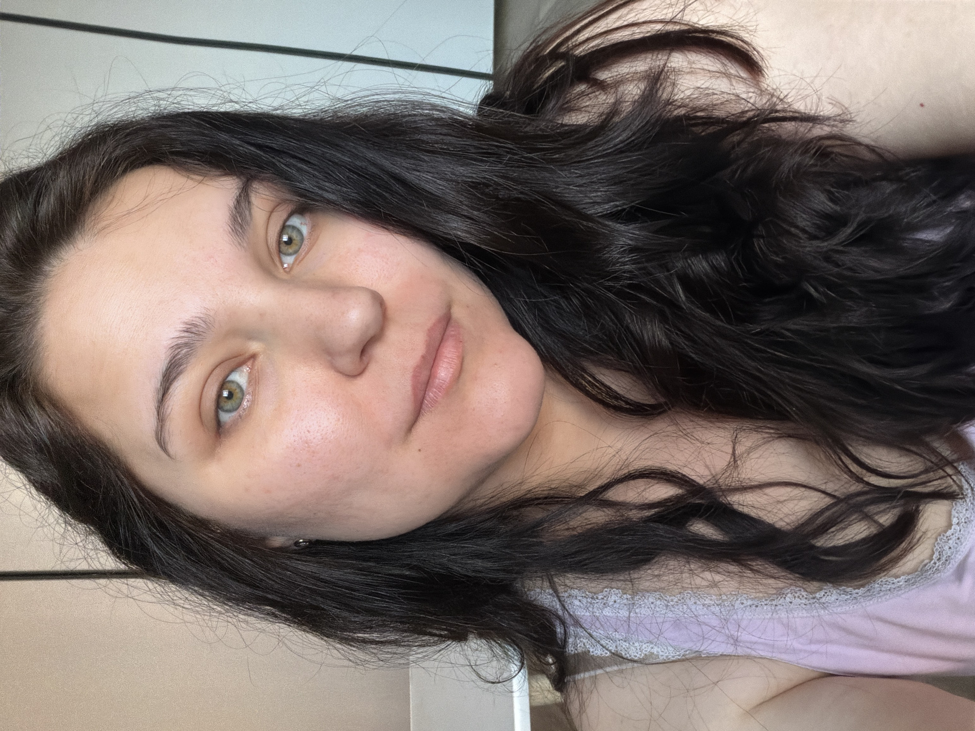 A close-up, head-and-shoulders portrait captured in the city of Chaikovsky, Russia, features a female individual looking directly into the camera. She has long, dark brown, wavy hair that frames her face and extends over her shoulders. Her eyes are green/hazel. Her complexion is fair, exhibiting natural skin texture with visible pores and some minor redness on the cheeks. Her lips are closed and appear unpainted. She is wearing a light pink or lavender tank top with white lace trim along the top edge of the garment. The background is out of focus, showing indistinct light-colored walls or surfaces with faint vertical and horizontal lines, consistent with an indoor setting.
