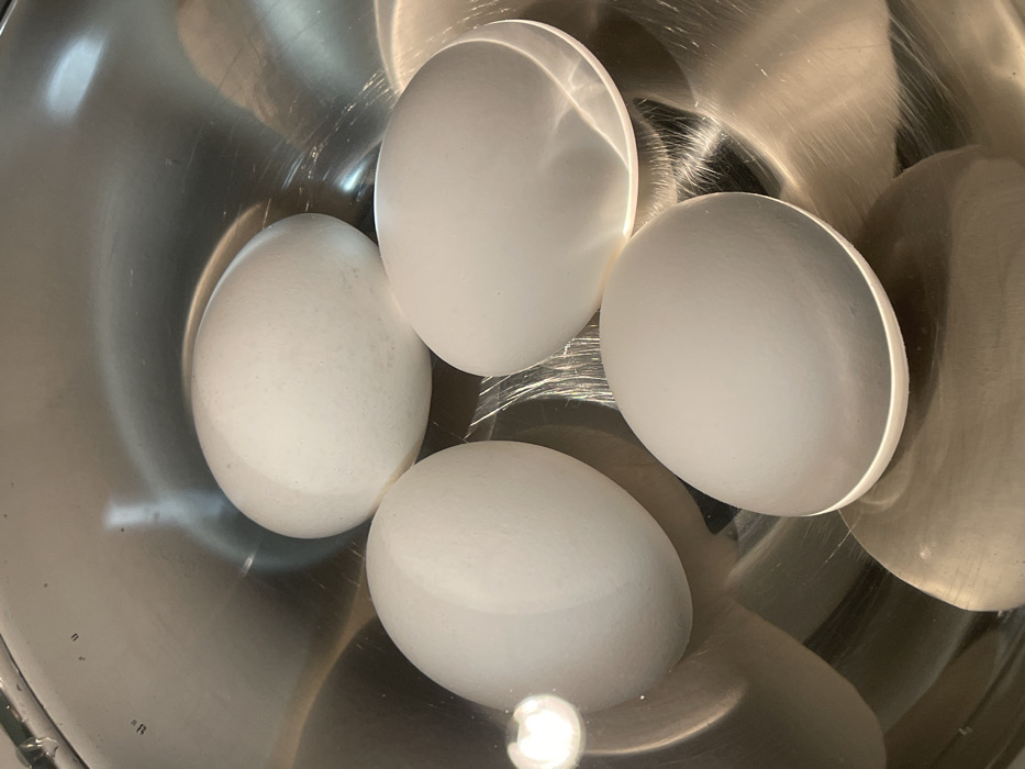 The scene is located in Moscow, Russia. This image presents four ovoid, white-shelled eggs resting within a reflective, metallic bowl, identified as stainless steel. A shallow quantity of clear, translucent liquid partially covers the base of each egg. The eggs are arranged in a loose grouping at the bottom of the bowl. Distinct reflections of an overhead light source are visible on the smooth surfaces of the eggshells and the inner, polished surface of the bowl, which also displays minor abrasions and striations. No human subjects, specific actions, or additional objects are discernible within the frame. The environment is consistent with an indoor setting.