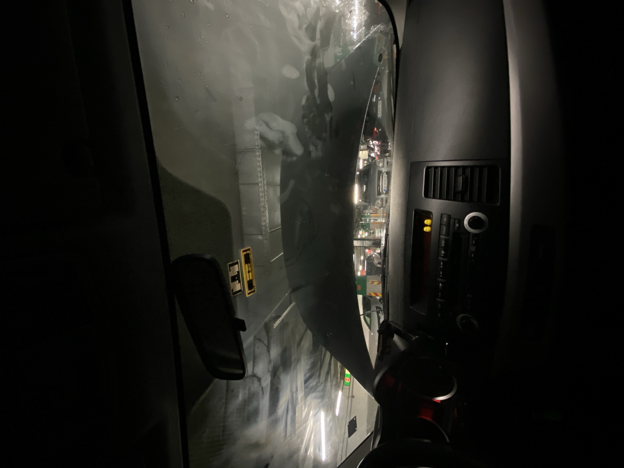 The image presents a view from the interior of a vehicle within an underground or multi-story parking garage in Sofia, Bulgaria. The perspective is from the driver's seat, looking forward through a windshield covered with water droplets or smudges. The vehicle's dark dashboard occupies the lower portion of the frame, showing part of the steering wheel on the left and the center console. The console features air vents, car stereo controls, and two illuminated yellow indicator lights. A rearview mirror is mounted centrally on the windshield, and a rectangular sticker, possibly a parking permit, is visible on the upper right side of the windshield. Beyond the windshield, the parking garage environment is illuminated by artificial fluorescent lights. Concrete ceilings, support beams, and exposed utilities are visible. Several other vehicles are parked or in motion. A silver sedan in the middle ground clearly displays Bulgarian license plate "CB 3035 CC". Behind it, a dark-colored vehicle shows license plate "CB 9141 XP". Both "CB" prefixes identify the city of registration as Sofia. A circular green traffic signal with a horizontal white bar (indicating an open or permissive status) is visible on the left side of the garage, and additional green lights are present further back. The overall lighting is dim, contrasting with the bright artificial lights.