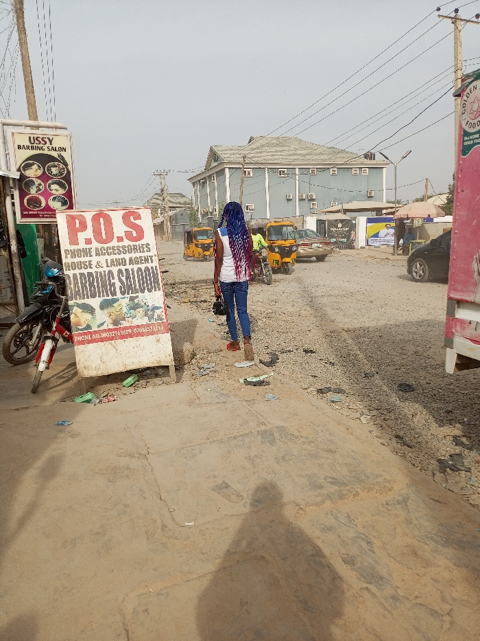 The image presents a daytime street scene in Aviation Quarters, Nigeria, characterized by a hazy sky. In the immediate foreground, a concrete sidewalk is visible, showing the shadow of a person. To the left, two commercial signs are positioned: a larger, lower A-frame sign advertising "P.O.S PHONE ACCESSORIES HOUSE & LAND AGENT BARBING SALOON" with phone numbers, and an upper, smaller rectangular sign for "USSY BARBING SALON" displaying various hairstyles. A red and white motorcycle is parked on the left, adjacent to these signs. A lone individual, appearing female, walks away from the camera on the unpaved, rutted dirt road. She wears a white sleeveless top, blue jeans, and reddish-brown shoes, carrying a dark handbag in her left hand. Her long, braided hair exhibits blue and purple/pink coloration. The road surface is uneven, appears dusty, and is littered with various debris, including green plastic bottles. In the midground, two yellow auto-rickshaws ("Keke Napep") are visible on the road, facing away from the camera. A person on a motorcycle is positioned between them. A light-colored sedan is parked behind the second auto-rickshaw, and a dark-colored vehicle is partially visible on the far right. The background features a prominent multi-story building with a light blue/grey facade and a corrugated metal roof, exhibiting multiple windows and external air conditioning units. Utility poles and overhead electrical wires span across the scene. On the far right, a partial "GOLDEN FOOD" sign is discernible. Other less distinct structures line both sides of the road.