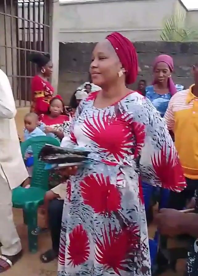 A group of people gather in an outdoor space. They are mostly dressed in colorful African-style clothing and some are carrying handbags or trays. A few people are sitting on plastic chairs. The area is partially enclosed by buildings and walls. There's a papaya tree in the background. The people seem to be talking amongst themselves.