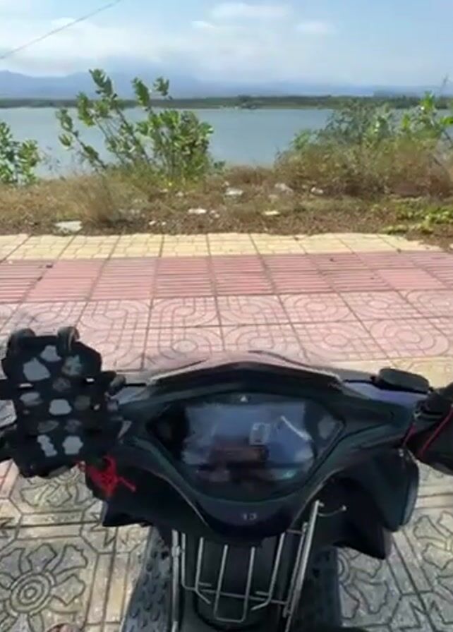 view from the seat of a parked scooter facing a body of water. The scooter has a digital display, a phone holder, and a front rack. The ground is paved with red and grey tiles. The water is a light blue color and extends to a green shoreline with trees and bushes. Distant mountains are visible in the background under a partly cloudy sky. There is a boat moving across the water. The video is somewhat shaky.