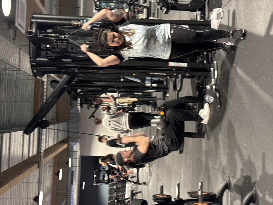 - "In a gym setting, a woman wearing a blue patterned shirt and black leggings stands at a cable machine, pulling down on the handles" by FM-sHh6Q2, licensed under CC BY 4.0
