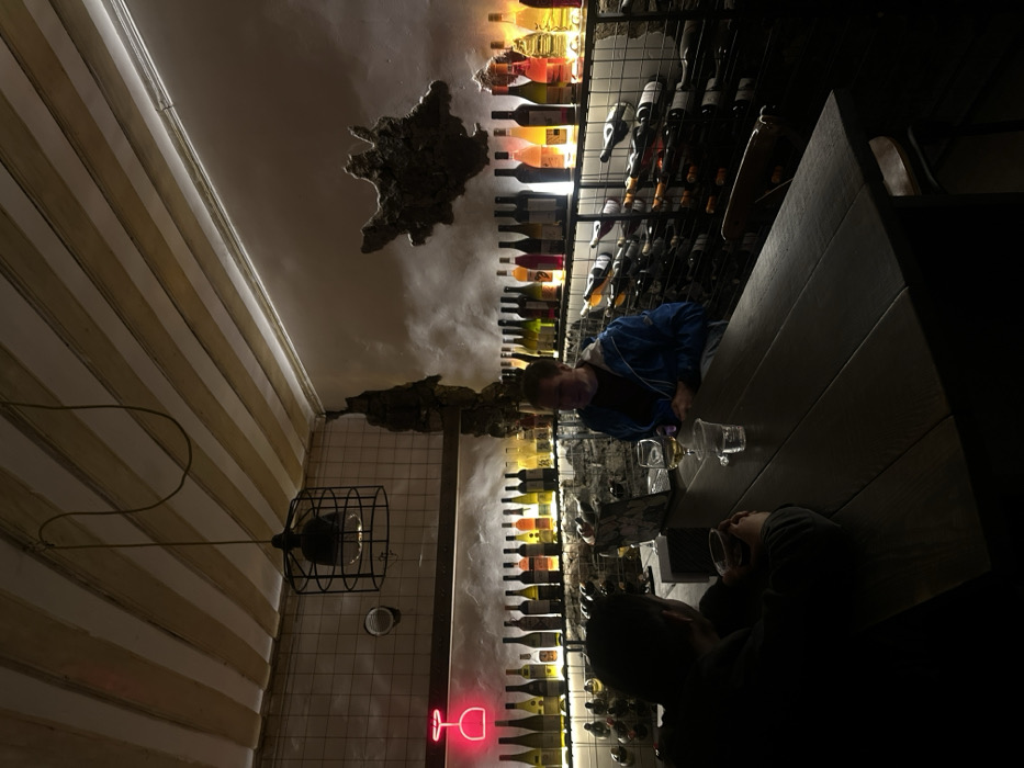 In a dimly lit bar, two patrons sit at a wooden counter. A man in a blue jacket looks at his phone, while another holds a glass. Shelves stacked with bottles of wine line the wall behind them. A wire cage light fixture hangs near a wall with a neon wine glass sign. The ceiling has decorative, irregular formations.