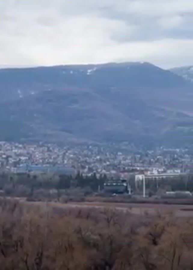 cityscape viewed from an elevated position, with a range of mountains in the background. The mountains have snow-capped peaks. The city is densely built with a variety of buildings. A wooded area is in the foreground. The sky is overcast at the beginning, but the sun peeks out.
