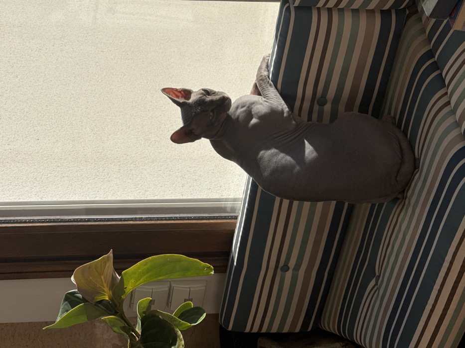 - "A hairless, dark grey Sphynx cat is positioned on a striped cushion within an indoor setting in Ponlat-Taillebourg, France" by FM-QhCsg2, licensed under CC BY 4.0