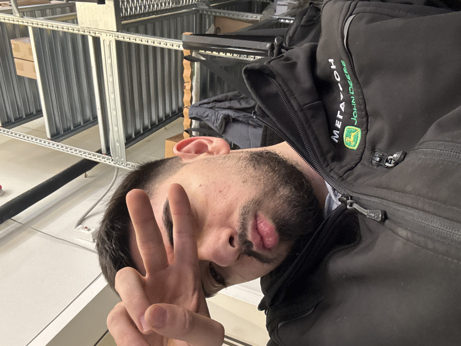 An individual male, appearing to be in his late twenties to early thirties, is depicted in an indoor setting. He has short dark hair, a trimmed beard and mustache, and is looking directly at the camera. His left hand is raised, with the index and middle fingers extended to form a V-sign, partially obscuring his left eye. His lips are pursed into a slight pout. He is wearing a dark, possibly black, zip-up jacket. On the right chest area of the jacket, an embroidered logo featuring the text "МЕГАТРОН" above the John Deere logo (a green leaping deer with "JOHN DEERE") is visible. A light-colored undershirt is visible at the collar. The background features a multi-tiered metal shelving unit with corrugated shelves, a few cardboard boxes on the upper shelf, a light-colored wall with an electrical outlet, and a black pipe or conduit. Another dark garment hangs in the mid-ground. The scene is consistent with a warehouse or service center environment, specifically a Megatron facility in Montana, Bulgaria, given the jacket's branding and provided contextual information.