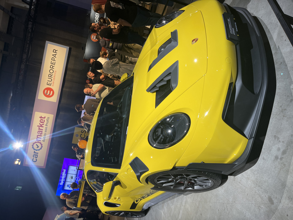 This image captures an indoor car exhibition scene, dominated by a bright yellow Porsche GT3 RS sports car, prominently displayed in the foreground