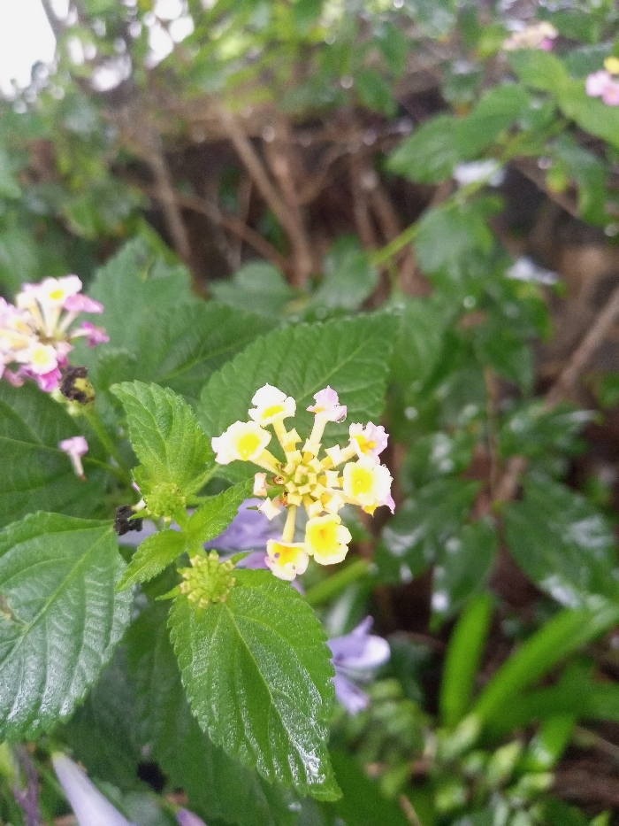 The image presents a close-up, high-detail view of a cluster of Lantana flowers in Beni, Nepal. The central flower cluster, positioned slightly right of the frame's vertical center, exhibits small individual blossoms with bright yellow centers transitioning to pale pink or white at their outer edges. One water droplet is visible on a pink petal of this cluster. Surrounding the flower are textured, serrated dark green leaves, several of which show distinct water droplets, indicating recent moisture. To the upper left, another, less distinct cluster of pink and white flowers is visible in the background, along with blurred green foliage and brown branches. Additional out-of-focus purple flowers are present in the lower background. The scene depicts a natural environment devoid of human subjects, actions, or interactions.