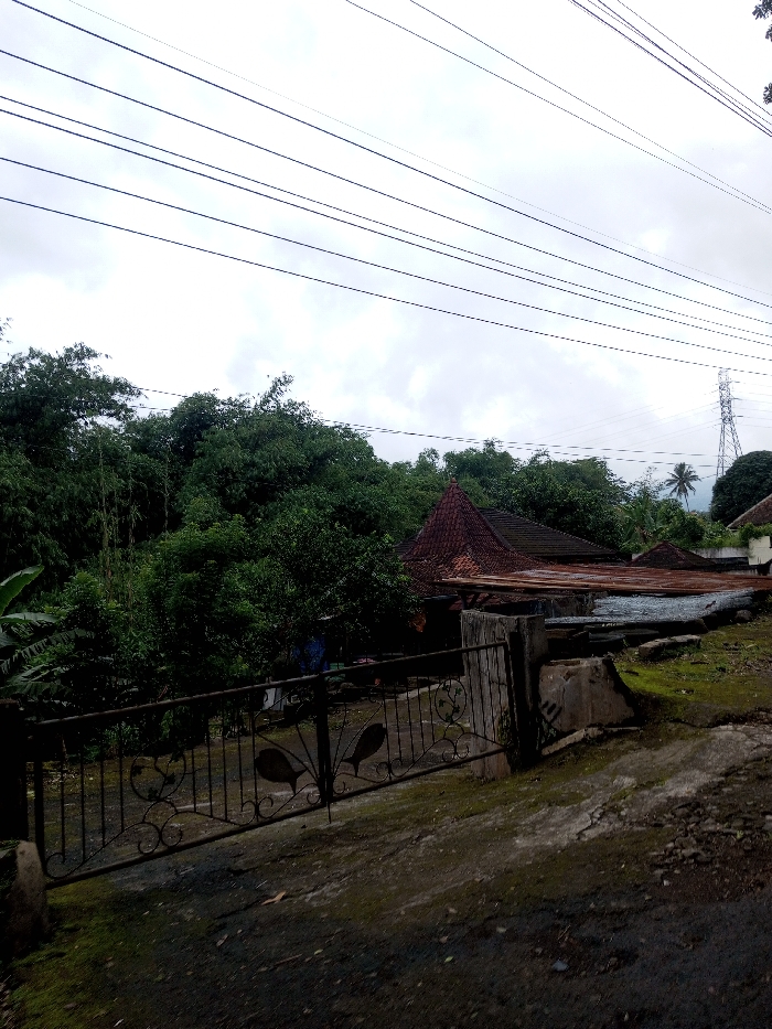 This image depicts a semi-rural scene in Kodarapalli, India, under an overcast sky. In the foreground, a dark, wrought-iron gate with decorative fish-shaped elements and scrollwork stands partially open or recessed, flanked by weathered concrete gateposts. The ground surface immediately in front of the gate consists of a dirt path or unpaved road, showing patches of moss and uneven terrain. Behind the gate, dense green foliage, including bamboo and various trees, dominates the midground. Several residential structures are visible amidst and behind the vegetation. One prominent building on the right features a multi-tiered, reddish-brown tiled roof. Adjacent and to its left, another structure has a rusty corrugated metal roof. A human figure, wearing a blue shirt, is partially observable amidst the trees and structures, seemingly situated behind the gate on the property. The background is characterized by a wide expanse of light grey, cloudy sky. Multiple parallel overhead power lines traverse the upper portion of the frame. To the far right, a tall metal lattice power transmission tower is distinctly visible against the sky and distant landscape. A palm tree and a faint outline of a distant hill or mountain range complete the horizon. No specific actions or interactions are clearly discernible. The overall lighting suggests a cloudy day with diffused light.