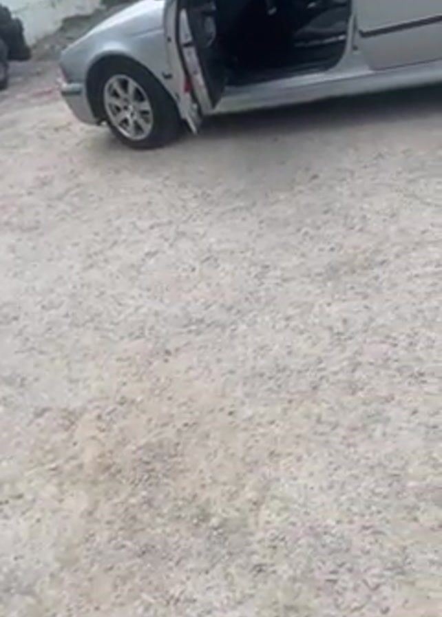 silver sedan parked on a gravel lot. The driver's side front door is open. In the background, a pile of tires sits against a white wall, and bare trees can be seen beyond the wall. The camera circles the car. The car has silver rims and black trim. There are no people visible in the video. The sky appears overcast.