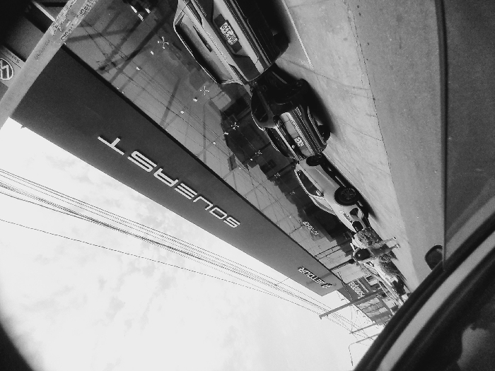 A black and white photo displays a street scene from a car's perspective. Several parked cars line the sidewalk. A sign reads "SOVERAST", with smaller text visible below. Power lines stretch across the sky. The street is wet, reflecting the parked vehicles and signage. A portion of the car's interior is visible in the foreground.