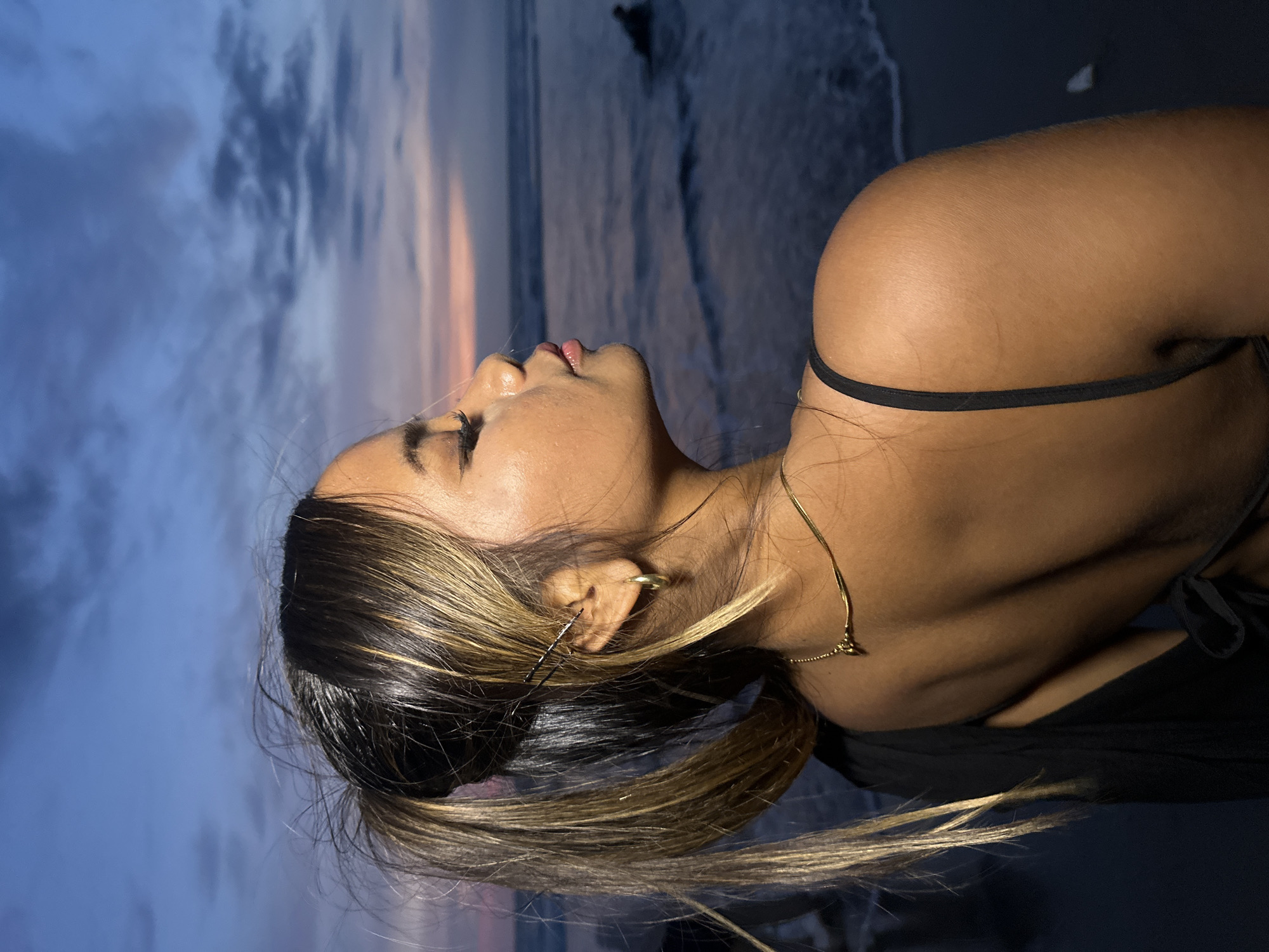 The scene depicts a beach in Kerobokan Kelod, Indonesia, during twilight. A female individual, appearing of Southeast Asian ethnicity, is positioned in profile, facing right with closed or lowered eyes. Her dark brown hair, featuring blonde highlights, is tied in a high ponytail, with a dark clip visible near her right ear. She is dressed in a black top with thin spaghetti straps and accessorized with a gold hoop earring in her right ear and a thin gold-colored necklace with a small pendant. The sky exhibits a gradient of deep blue, purple, and a subtle orange-pink at the horizon, under a cloudy overlay. The dark ocean surface displays moderate waves breaking onto the dark sandy beach. A dark, partially submerged, indistinct form is visible in the water in the middle-right background.