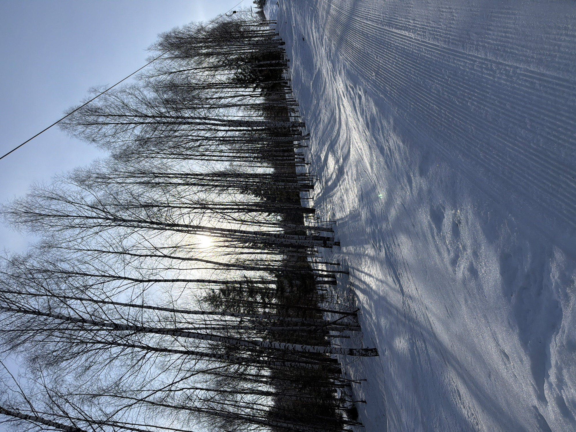 The image displays a winter landscape at a ski area in Gubakha, Russia, characterized by bright sunlight and snow-covered terrain. A dense line of bare deciduous trees, primarily birches with some interspersed evergreens, extends across the midground from the left to the right. The sun is positioned behind these trees on the left side, casting long, distinct shadows across the snow-covered ground towards the foreground. The sky above is clear and light blue. The lower right portion of the image reveals a groomed ski slope, identifiable by parallel corduroy patterns in the snow. In the upper right background, a structure consistent with a ski lift pylon and a diagonal cable are visible against the sky. No individuals, actions, or interactions are present in the scene.