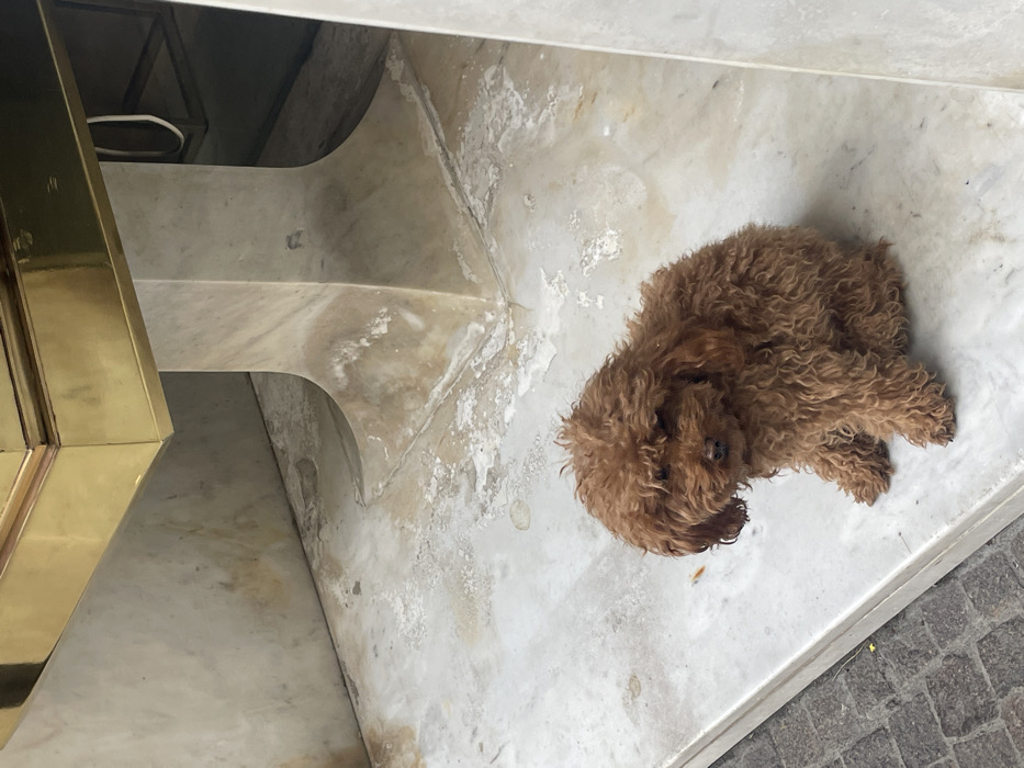 - "A small, reddish-brown, curly-coated dog, resembling a Poodle, is depicted sitting passively on a worn, light-colored marble platform within a public or semi-public area of Sorrento, Italy" by FM-4OCh93, licensed under CC BY 4.0