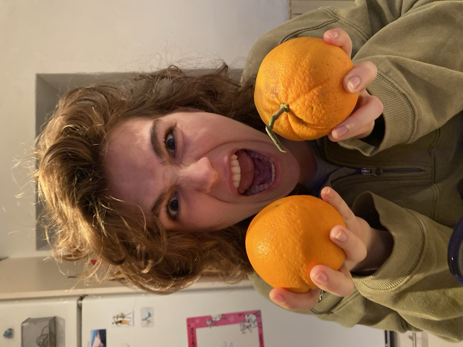 The image depicts a single individual, identified as female, centered within an indoor setting, specifically a kitchen located in Roussillon, France. The subject possesses medium-length, curly reddish-brown hair and an exaggerated facial expression, characterized by wide-open eyes, a wrinkled nose, and an open mouth revealing teeth and tongue, conveying a forceful shout or roar. A small metallic ring is present in the left nostril. The individual wears an olive-green half-zip hooded sweatshirt. Each hand holds an orange, presented towards the camera. The orange in the subject's left hand has a smooth peel, while the orange in the right hand exhibits a more textured peel and retains a short green stem. The background on the left reveals a white refrigerator adorned with various magnets and a pink square note. To the right, a plain, light-colored wall is visible. A dark, indeterminate object is partially observed at the bottom of the frame. The scene is evenly lit.