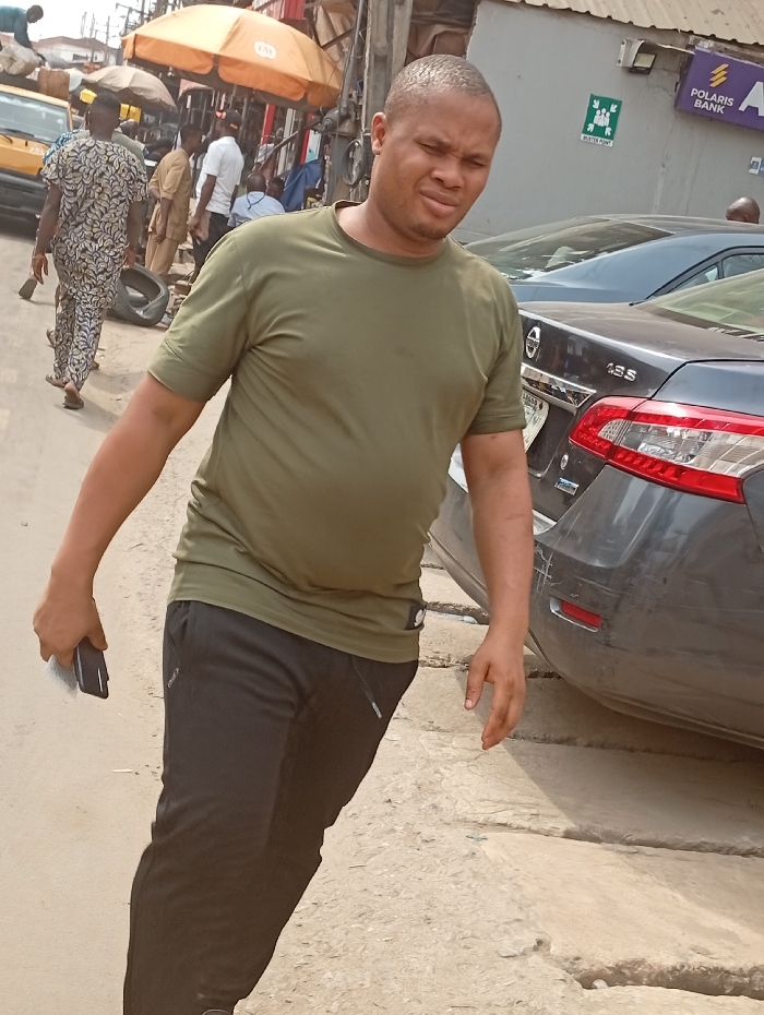 A man wearing an olive green t-shirt and black track pants walks on a street with a phone in his hand. Behind him, several people walk on a busy street with market stalls. A yellow taxi and parked cars are visible. A Polaris Bank sign is in the background. The street surface appears uneven with visible cracks and dips.
