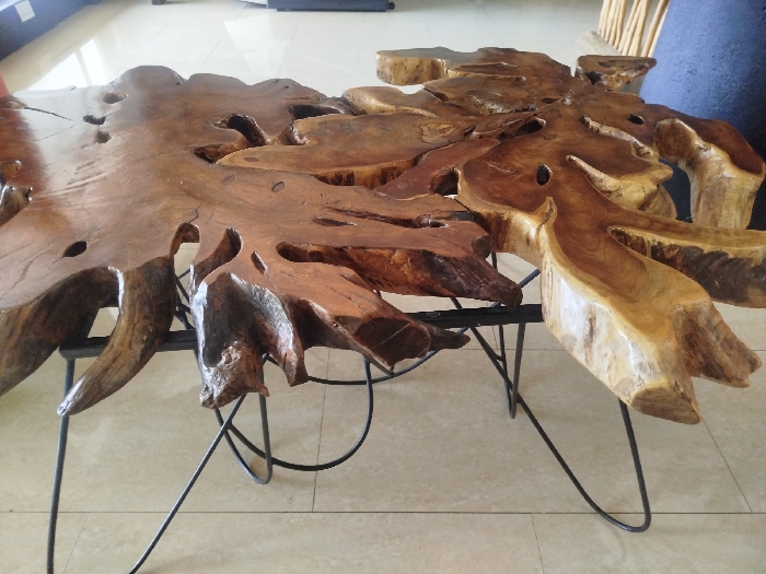 The image displays an indoor setting centered on a large, organically shaped coffee table. The table's surface is a substantial slab of natural wood, exhibiting a highly irregular, abstract form with multiple lobes, protrusions, and natural voids throughout. The wood features varying shades of brown and tan, visible grain patterns, and a polished finish, with some surface cracks evident. This wooden top is supported by a black metal base comprising multiple thin, angled hairpin-style legs. The table rests on a floor composed of large, light-beige or off-white tiles. In the blurred background, a dark blue or black upholstered object is partially visible to the right, behind which are several light-colored vertical wooden elements. No individuals, specific actions, or interactions are depicted. Based solely on the visual evidence, there are no identifying features present to confirm the precise location within Nairobi, Kenya.
