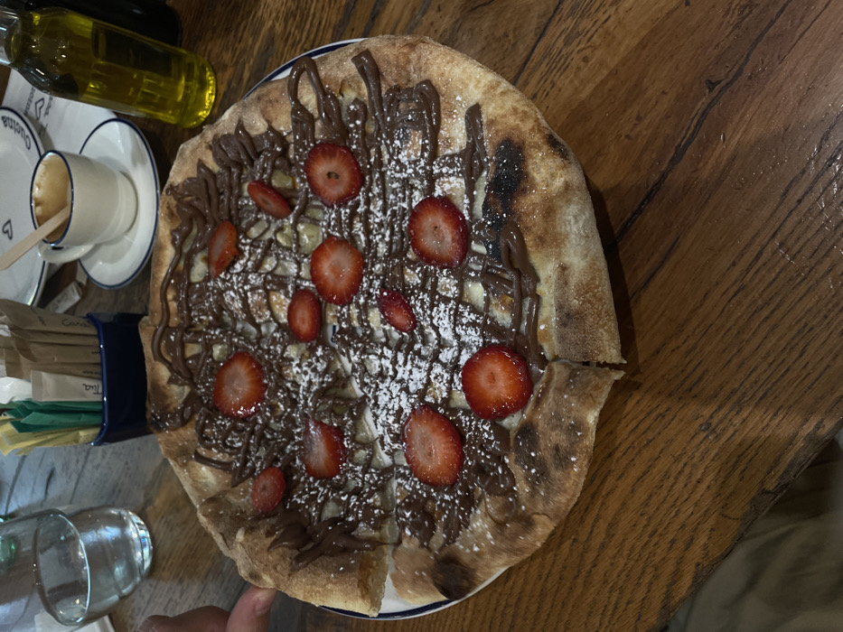 - "A sweet pizza is presented, topped with chocolate drizzle, sliced strawberries, and a dusting of powdered sugar" by FM-otcHd2, licensed under CC BY 4.0