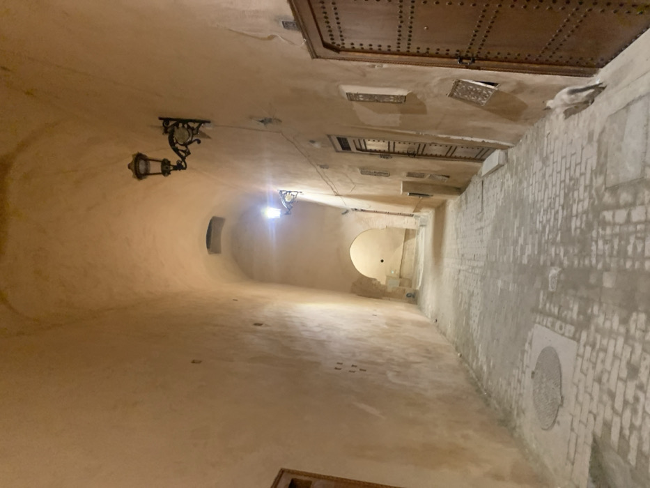 An old, narrow hallway with a vaulted ceiling is dimly lit by hanging lanterns. One side has a smooth, curved wall; the opposite side features exposed brickwork. The ceiling shows ornate doors and decorative recessed panels. At the end of the hallway, a lit archway leads further into the structure. A manhole cover is visible on the brick-laid side. The hallway appears to be part of a historic building.