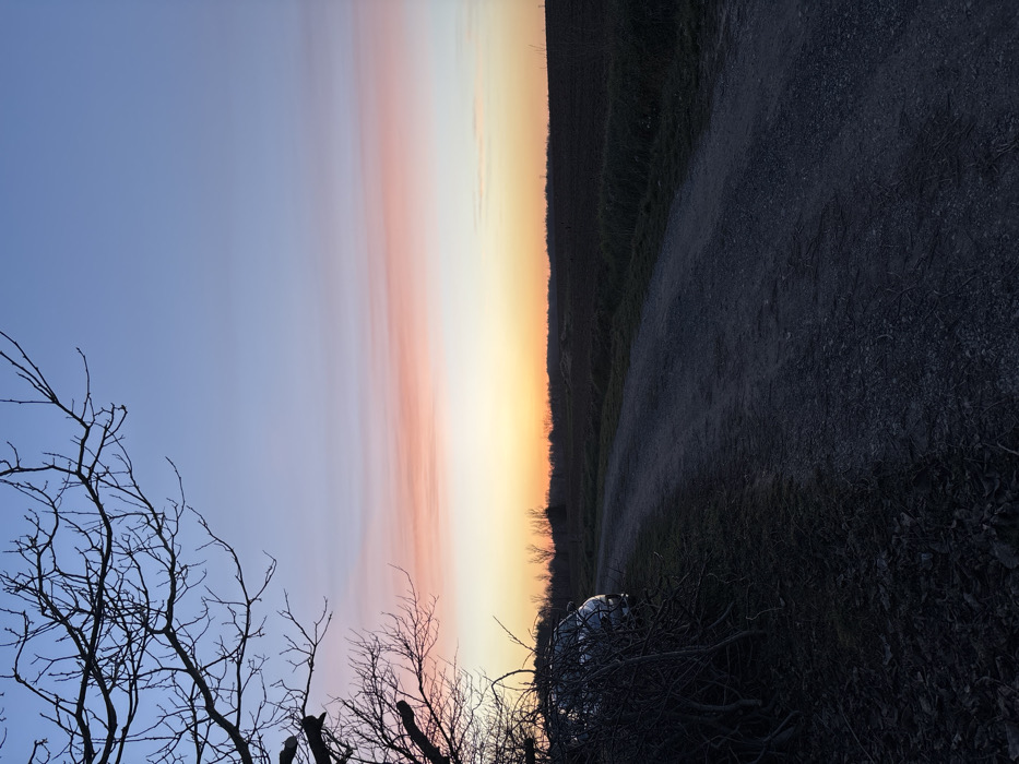 The image depicts an outdoor, rural landscape at twilight in Balinovtsi, Bulgaria. The sky transitions from light blue at the top, through a prominent horizontal band of pale pink and red, to an intense orange-yellow glow at the horizon. In the left foreground, a dense cluster of dark, leafless tree branches and shrubbery is silhouetted. Partially obscured behind this vegetation, the front passenger side of a light-colored vehicle, likely a car, is visible. It shows parts of its front bumper, headlight, and hood. A dark, unpaved gravel or dirt road curves from the lower-left foreground towards the center-right, receding into the distance. Adjacent to the right side of the road is a dark, open field, possibly tilled or fallow. A dark, indistinct line of trees or dense vegetation forms the distant horizon. No individuals, overt actions, or interactions are visible.