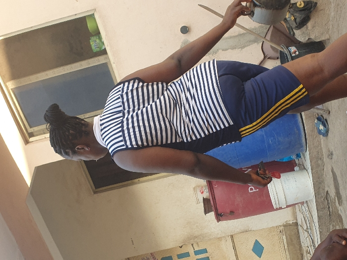A dark-skinned woman with braided hair bunched on her head is seen outside. She wears a striped tank top and blue shorts with yellow stripes. She holds keys in one hand and a metallic pot in the other. In the background is a window, a red barrel, a blue drum, a white bucket, and various objects scattered on the ground. The woman is turned away from the viewer, focusing on something out of frame.