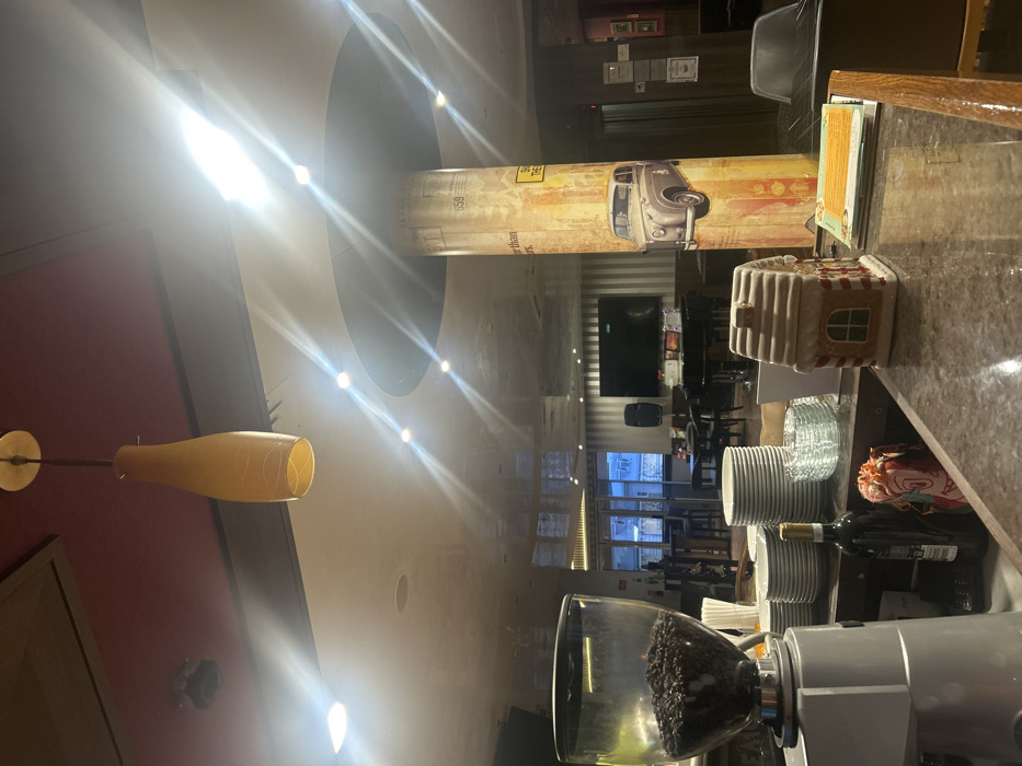 The image depicts the interior of a cafe or bar in Silistra, Bulgaria, characterized by modern decor and artificial lighting. In the immediate foreground, a granite-patterned bar counter is visible. On the left, a grey electric coffee grinder with a clear hopper full of dark coffee beans is present. Behind it, a stack of white ceramic plates is neatly arranged. To the right, a dark bottle, possibly wine, with a label, stands next to a draped red and orange fabric item. Further right, a stack of clear glass saucers and a distinct house-shaped ceramic container with red and brown details are placed on the counter. A menu or informational sheet with yellow text lies on the far right of the counter. The midground features a spacious seating area. A large, cylindrical pillar dominates the center-right, adorned with an illustration of a vintage car and partial text including "659." Beyond the counter, tables and chairs are arranged for patrons. On the far left, large glass doors or windows offer a view to a blurry exterior. Centered against a vertically striped wall, a large flat-screen television is mounted above a dark piano or keyboard. A speaker is positioned to the left of the television. The establishment appears unoccupied by people. The ceiling features multiple levels, including a dark red section, a lighter cream area, and reflective surfaces, from which numerous recessed spotlights emit bright light. A single, elongated, pale yellow pendant lamp hangs from the ceiling near the top center of the frame. The overall environment is well-lit and appears tidy.