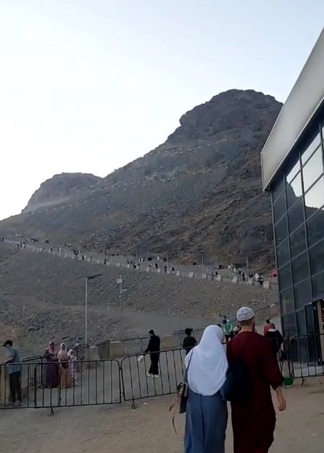 low-angle view of a dusty area at the base of a rocky mountain. A long, winding staircase is visible on the mountainside, with numerous people walking up it. At the right side of the frame is a modern building with large windows. A metal barricade runs horizontally across the middle of the frame, separating the viewer from the pathway leading to the staircase. A couple, a woman in a light blue dress and white headscarf and a man in a maroon robe and white cap, are walking away from the camera in the foreground. Other people, dressed in various forms of modest attire, are also walking around or standing near the barricade. The sky is light and overcast.
