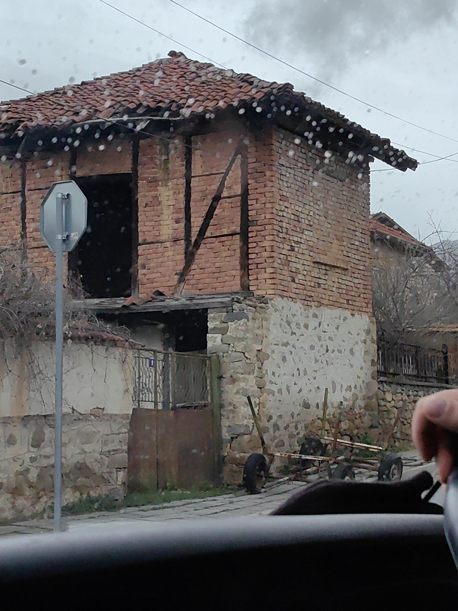 The image depicts a deteriorated, two-story building in what appears to be Mirkovo, Bulgaria, observed from within a vehicle. The upper level is constructed of red brick, with a dilapidated red-tiled roof. Timber framing is visible, suggesting a partially constructed or unfinished state. The lower level is comprised of stone and weathered plaster. A gated entryway is partially obscured by foliage. A stop sign is adjacent to the building. In the foreground, a vehicle windshield displays raindrops and an obscured view of a cart or trailer with multiple wheels positioned on a paved street. A hand is visible inside the vehicle. The sky is overcast and suggests rain.