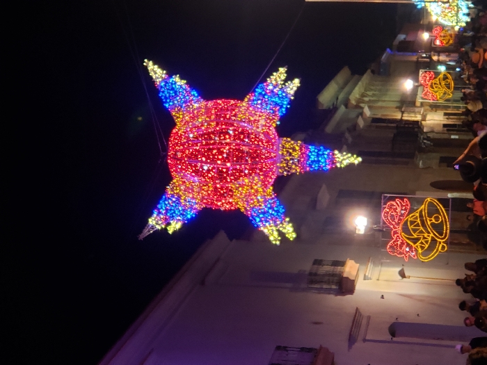 A festive night scene displays vibrant Christmas decorations. A large, spherical ornament with projecting arms dominates, illuminated with red, blue, and yellow lights. Further down the street, smaller decorations shaped like bells emit a warm glow. Buildings flank the decorations, their details visible under street lighting. A crowd of onlookers appears on the right side, their figures indistinct in the dim light. The overall atmosphere is celebratory and bright against the night sky.