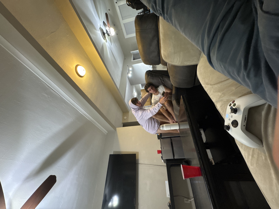 This image depicts an indoor residential living space within South Bend, United States. The scene is captured from a low, seated perspective, showing the observer's legs in dark blue pants with a white Xbox Series X/S controller resting on their lap. In the midground, a dark wood coffee table features a red plastic cup and a white insulated water bottle. Behind it, a wall-mounted black television is visible above a black media console. To the right of the console, a compact silver and black refrigerator holds a red plastic cup on its top. Two males occupy the central area. One male, wearing a light purple hooded sweatshirt with the hood up, is standing or leaning over, appearing to interact with a smartphone held by the second male. His lower body is not clearly visible. The second male, wearing a white t-shirt and light-colored shorts, is reclined in a dark brown leather armchair, focused on a smartphone in his hands. The background reveals an extension of the living space, possibly a kitchen or dining area, with additional lighting fixtures including three track lights and a doorway. The ceiling features light-colored painted surfaces, exposed structural beams with crown molding, and includes two dark-bladed ceiling fans and a circular flush-mount light fixture. The walls are light-colored.
