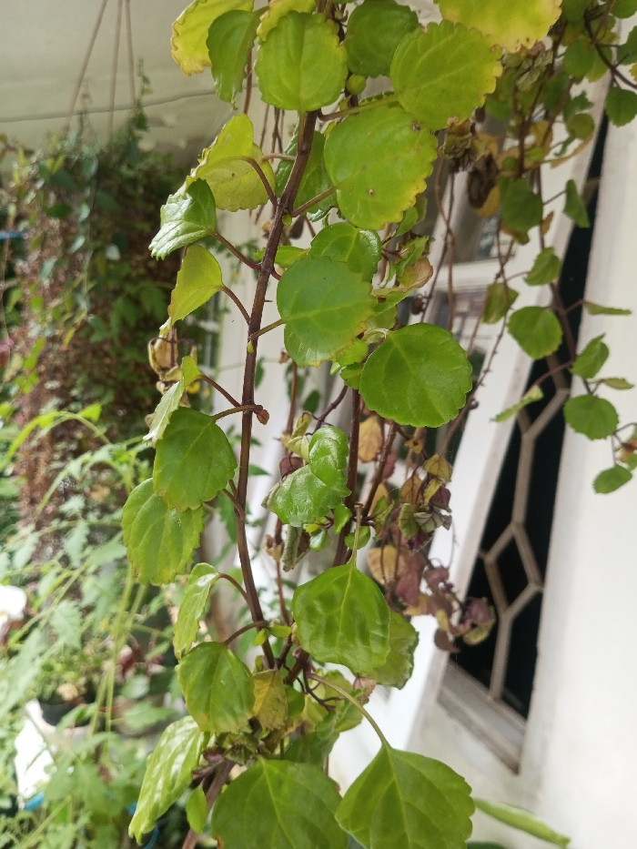 The image presents a close-up, vertical shot of a trailing plant with numerous small, round to ovate leaves and slender reddish-brown stems, observed in Bhendala, India. The leaves are primarily light to medium green, with some exhibiting yellowing or browning, and possess slightly serrated margins. The plant appears to be hanging or cascading. In the blurred background to the left, additional green foliage is visible, indicative of a garden or densely planted area. To the right, a portion of a white building structure is present, including a partially visible window or opening with a dark interior and a light-colored frame, possibly featuring a grid pattern. No individuals are depicted. The scene is illuminated by natural daylight.