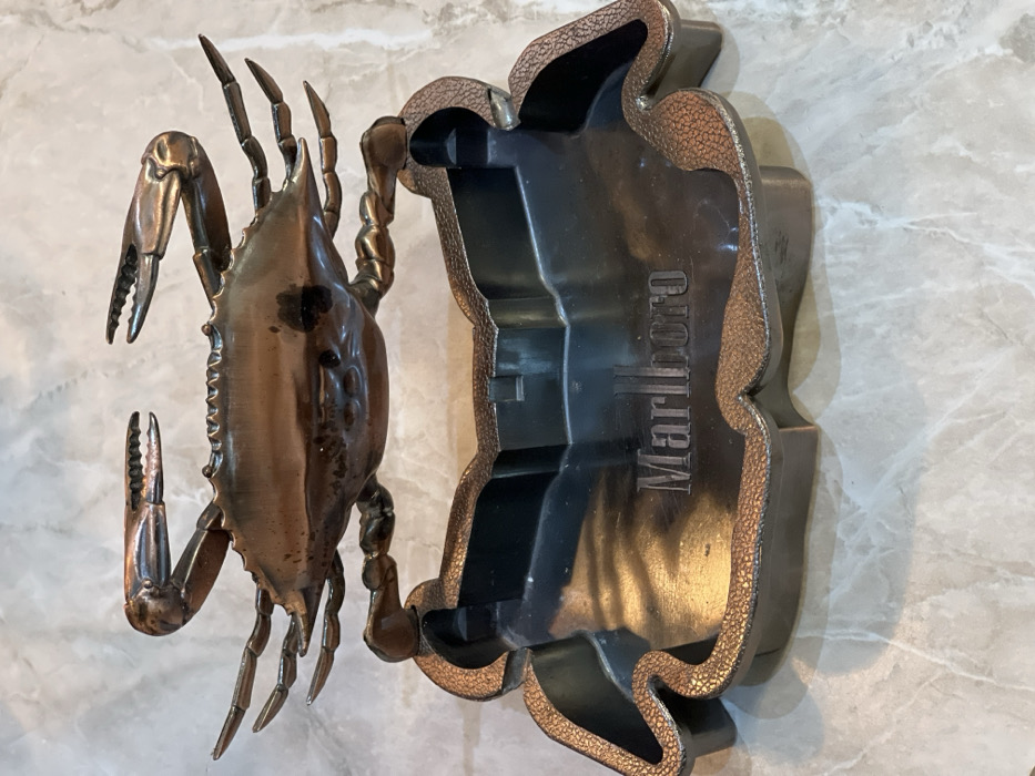 The image depicts a scene located in Smolyan, Bulgaria. The primary subject is a decorative ashtray, centered and viewed from a slightly elevated perspective, resting on a polished, light-colored surface with dark grey and light brown veining, consistent with natural stone. The ashtray is comprised of a dark, smooth, matte metallic interior basin and a reddish-brown, bronze-toned exterior. An intricate, stylized crab figure, matching the exterior's metallic finish and exhibiting a textured surface, is mounted above the basin. The crab displays prominent, open claws and eight articulated legs. The word "Marlboro" is debossed into the central base of the ashtray's interior basin.
