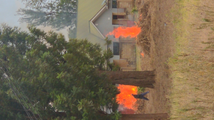 A vertical shot depicts a house with flames erupting near it, partially obscured by trees