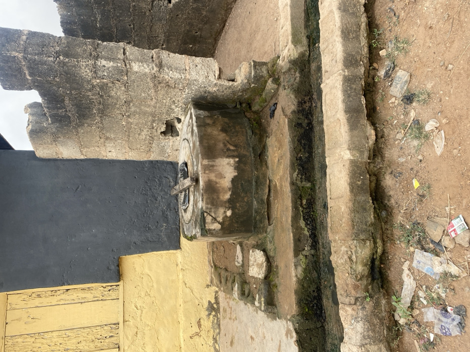 A weathered exterior scene shows an old building with yellow, black, and gray painted walls. A concrete well or cistern stands prominently, its surface stained and aged. Adjacent to the well is a narrow, mossy concrete channel or ditch. Litter is scattered on the ground nearby, suggesting a neglected or public space. The building appears to be constructed of concrete bricks.