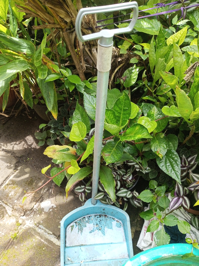 An outdoor scene in Mindat, Myanmar, displays a light blue plastic dustpan with a silver-toned metallic handle, standing upright on a surface comprised of concrete paving stones and exposed soil. The dustpan's reflective front surface exhibits distorted reflections of the surrounding plant life and appears used, with dirt residue visible. The handle features a D-shaped grip and a light-colored, cylindrical material wrapped around its shaft. Dense green foliage dominates the background, consisting of various plant species including broad-leafed plants, smaller shrubs, and identifiable striped-leafed *Tradescantia* varieties. Some leaves show minor discoloration. Partially visible objects within the foliage include a brown terracotta pot on the left, a white fabric sack, and a turquoise circular basin on the right. A thin purple cord is tautly stretched horizontally amidst the upper right foliage. The scene is illuminated by ambient daylight. No individuals are present.