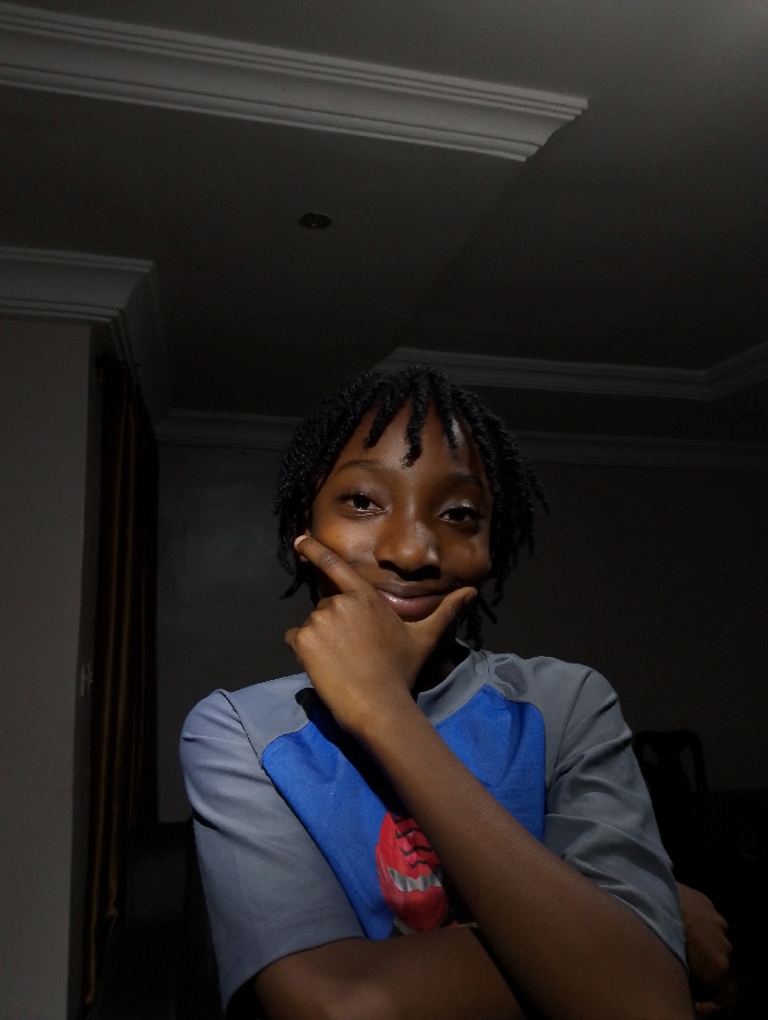 A young individual with dark skin and dreadlocks is depicted in a waist-up portrait taken indoors