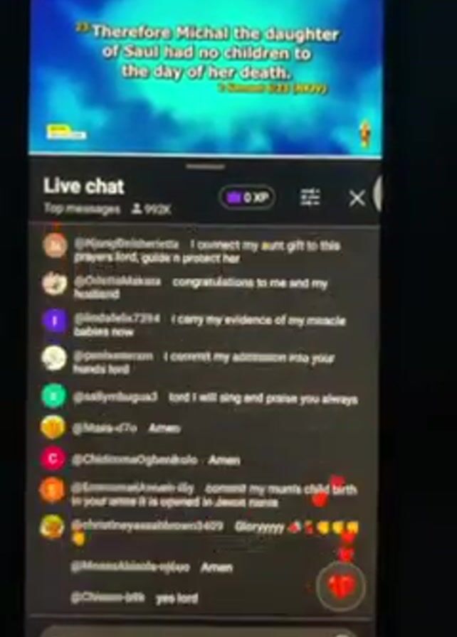 Here is a concise description of the video. The video shows a smartphone screen displaying a live stream. The top portion features a religious message on a blue background, followed by a live chat section with numerous messages and usernames. The messages consist of prayers, affirmations, and expressions of faith. As the video progresses, the streamed content transitions to a video of a man in a suit playing a saxophone with a band behind him, in what appears to be a church setting. The live chat continues with viewers interacting and sending messages of praise and support.