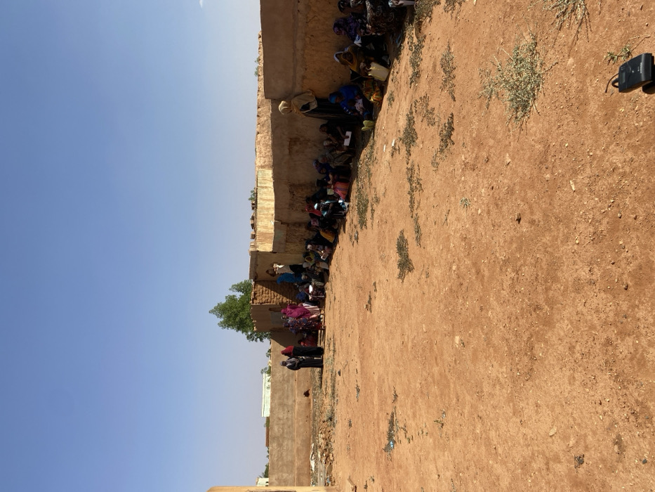 The image depicts an outdoor gathering in Omdurman, Sudan, under a clear, cloudless blue sky