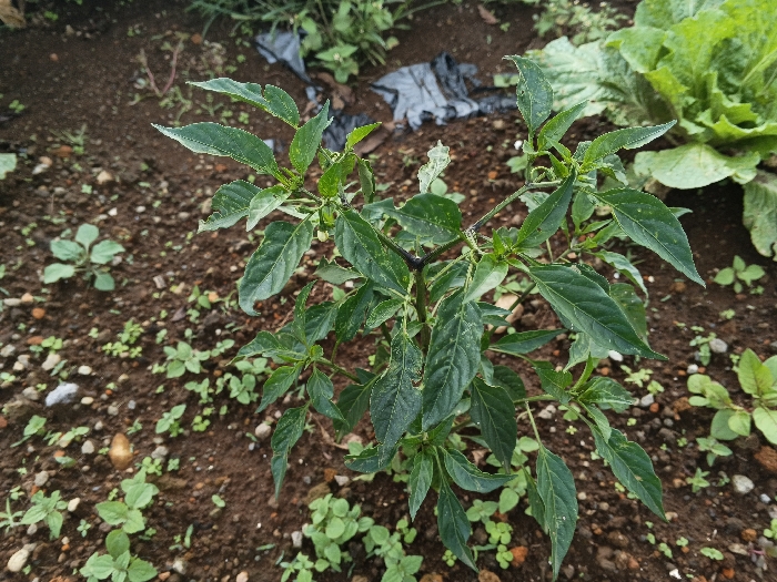 The image displays a high-angle view of a cultivated outdoor plot. A central, dark-stemmed plant, consistent with a young chili pepper (Capsicum) plant, is the primary subject. It exhibits numerous dark green, ovate leaves, some showing minor signs of distress or insect damage. The plant is rooted in dark brown, granular soil, which is sparsely populated with small green weeds and scattered light-colored pebbles. In the upper right background, a portion of a larger, light green leafy plant, resembling a cabbage or similar Brassica species, is visible. Adjacent to this larger plant, on the soil, lies a crumpled black plastic bag. The scene is illuminated by natural, diffused light, suggesting an overcast condition or partial shade. No individuals are present, and no active human or animal interactions are observable. The location is Ho Chi Minh City, Vietnam.