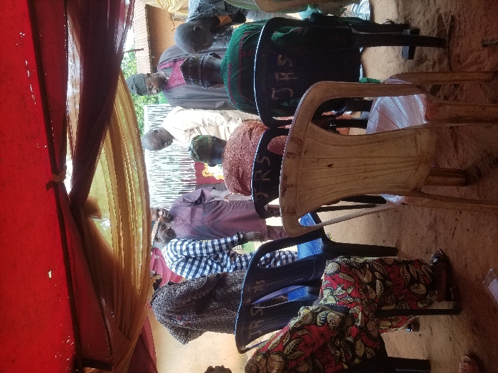 An outdoor gathering is depicted in Ochadam, Nigeria, taking place under a red fabric canopy draped with a lighter, possibly beige, translucent fabric