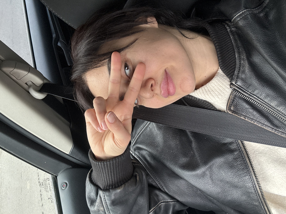A woman poses in a car, wearing a black leather jacket over a white sweater and secured by a seatbelt. She's holding up a peace sign near her face. The car's interior is visible with the window and headrest. The woman has dark hair, fair skin, and her expression is playful with slightly parted lips. The lighting suggests daylight.