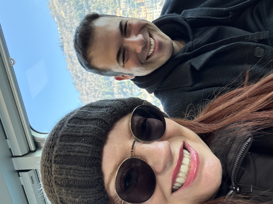 This image captures two individuals inside a funicular cabin, likely part of the Como-Brunate Funicular in Como, Italy, with a panoramic view of the cityscape and mountains through the window