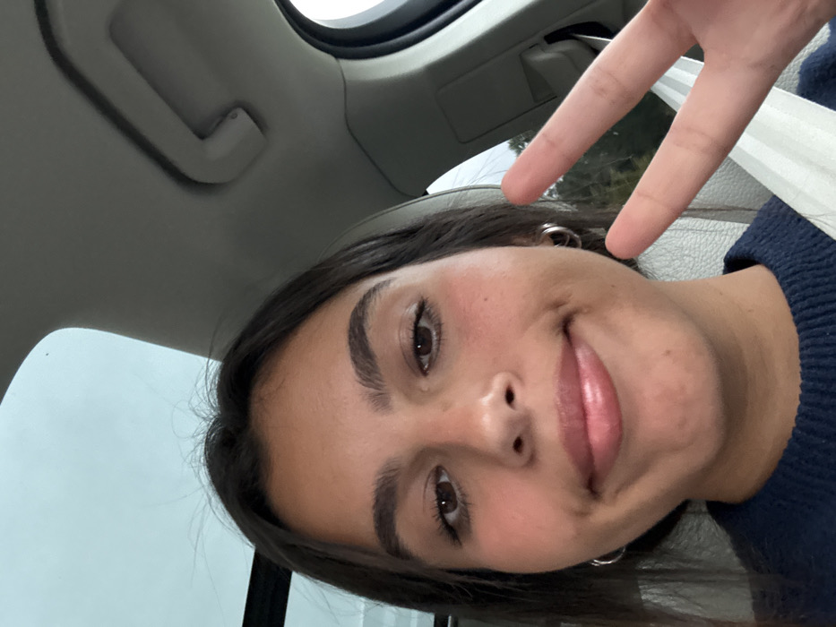 An image taken from within a vehicle captures a young female subject, likely a selfie, in what is identified as Lawrence Township, United States. The subject has dark hair, brown eyes, and light brown skin tone, displaying a subtle smile or smirk. She is wearing a dark blue crewneck sweater and silver hoop earrings. Her right hand is positioned in the lower right foreground, displaying a "peace" or "V" sign. A white seatbelt strap is visible diagonally across her chest. The vehicle's interior features a light-colored headliner with a visible overhead grab handle and a partially open sunroof revealing an overcast sky.