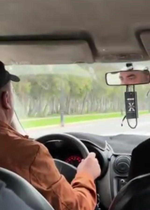The video, filmed from the back seat of a car, shows the driver, a man wearing a baseball cap and brown jacket, operating the steering wheel