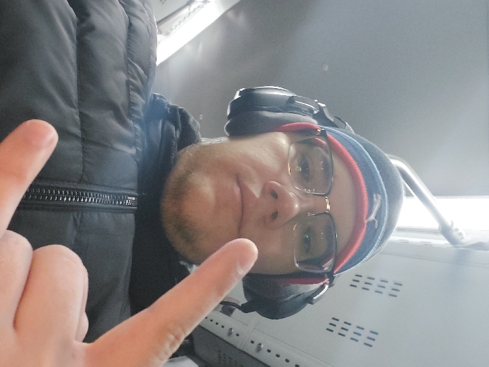 A person wearing glasses and headphones poses upside down. They wear a blue and red beanie and a dark puffer jacket. Their fingers are positioned upward in a "rock on" hand gesture. The background appears to be the interior of a vehicle or building with bright overhead lighting. Part of a white structure with ventilation slots is visible near the bottom of the frame.