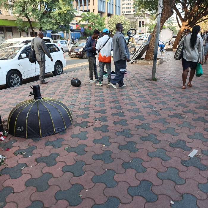 The image depicts an urban street in the central business district of Nairobi, Kenya. The foreground consists of a sidewalk paved with interlocking reddish-brown and dark grey concrete pavers. On the left side of the pavement, a black, partially collapsed Godox photographic softbox rests on its side. To its right, a small black cylindrical object lies on the pavers. Scattered organic debris and small pieces of litter are visible on the ground. Five individuals are present within the scene. On the far left, a male subject, dressed in a grey suit and carrying a black backpack, stands facing the street next to a parked white SUV. To his right, a group of three male subjects is clustered. One male, wearing a dark blue hooded jacket, is looking down at a smartphone. Adjacent to him, a second male, wearing a white shirt with an orange pattern and a light blue baseball cap, is observing equipment mounted on a stand. A third male, in a grey long-sleeved shirt, is walking towards the left. Near this group, a light stand with a circular lighting fixture is visible, along with another piece of photographic equipment leaning against a tree trunk. Further right, a large white octagonal softbox or reflector is positioned near the tree. On the far right, a female subject, wearing a light grey top, dark skirt, and red sandals, is walking away from the camera, carrying a patterned shoulder bag and a green plastic bag. The background features a multi-lane asphalt street with several vehicles, including parked cars and others in motion. Beyond the street, multi-story modern buildings with various architectural details line the horizon. Trees with green foliage are present along the sidewalk. The scene is illuminated by natural daylight.